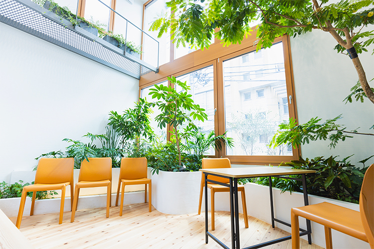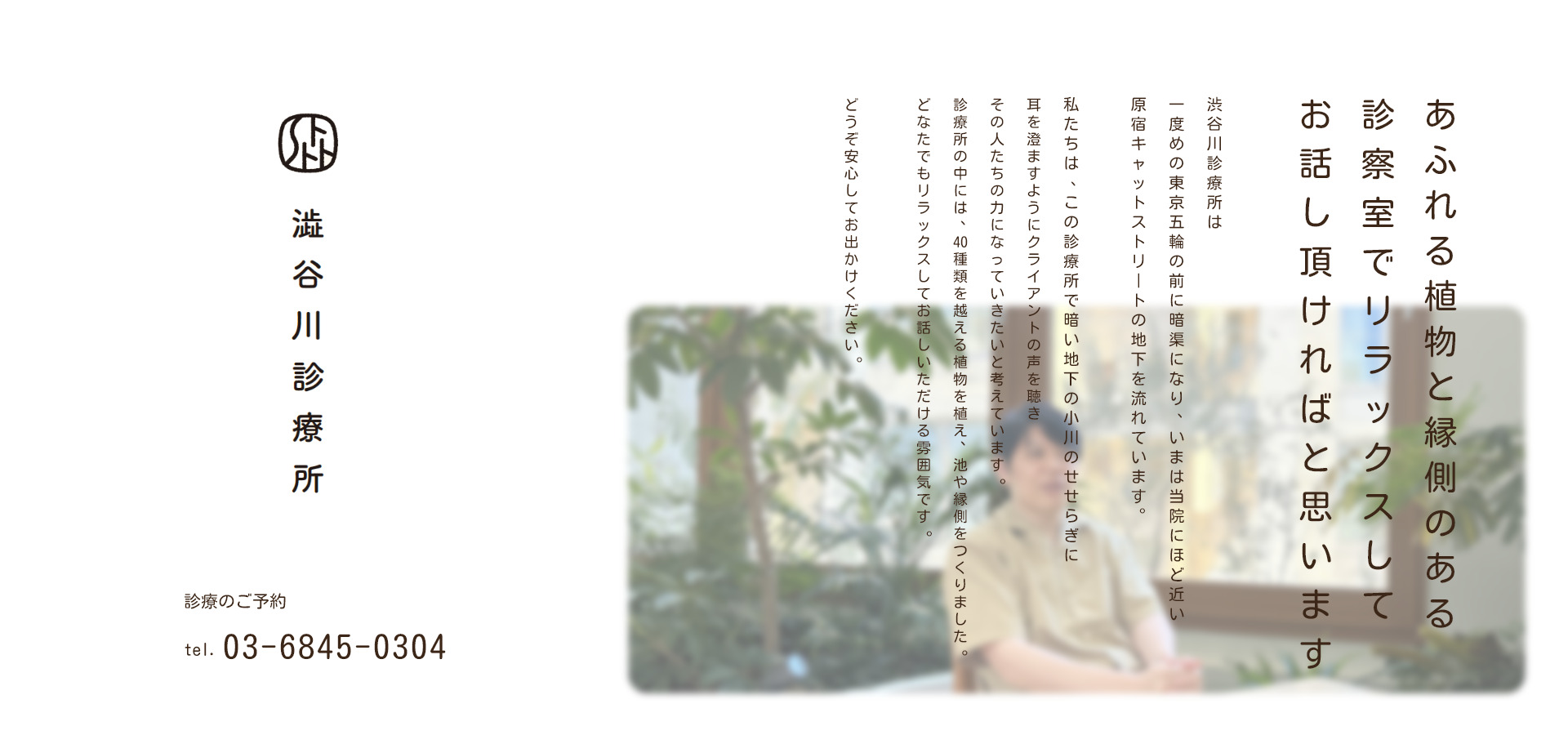 私たちは、この診療所で、暗い地下の小川のせせらぎに耳を澄ますようにクライアントの声を聴き、その人たちの力になっていきたいと考えています。診療所の中には、40種類を越える植物を植え、池や縁側をつくりました。どなたでもリラックスしてお話しいただける雰囲気です。どうぞ安心してお出かけください。